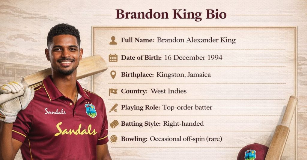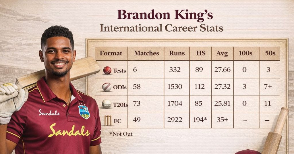 Brandon King made his T20I debut for West Indies in 2019, and has since become a regular fixture in both ODI and T20I squads. According to ESPNcricinfo’s career statistics summary (through early 2026):